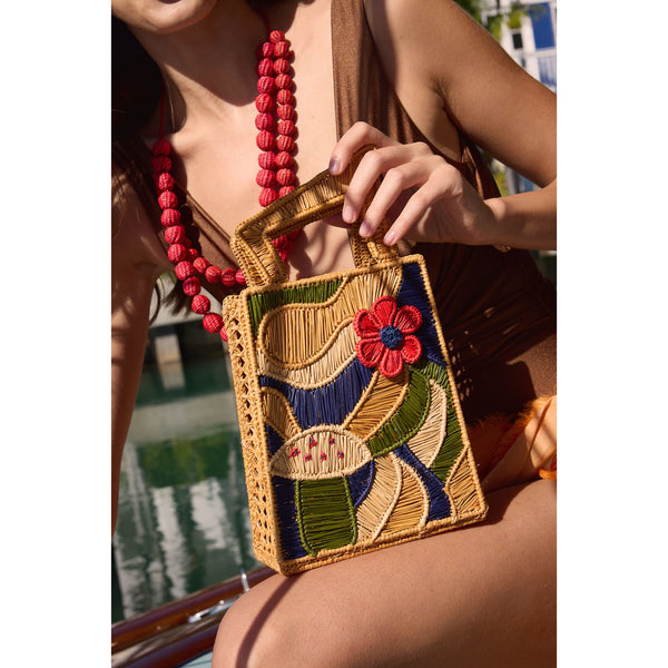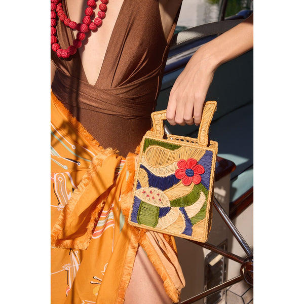 A structured woven straw handbag designed to brighten any summer look, perfect for vacations, garden parties, or warm-weather outings. Featuring a colorful wonderland motif and a geometric top handle, its compact silhouette carries your essentials while adding a playful artisanal touch.