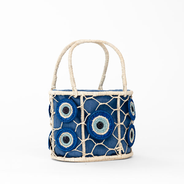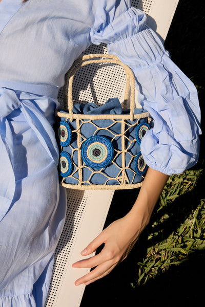 A charming handwoven straw bag adorned with playful evil eye motif. Compact yet functional, it’s designed to bring a lighthearted touch to warm-weather looks. Finished with a structured shape and top handles, it’s the perfect companion for sunny days, weekend outings, and summer escapes.