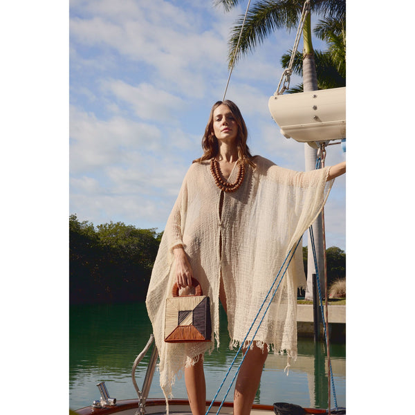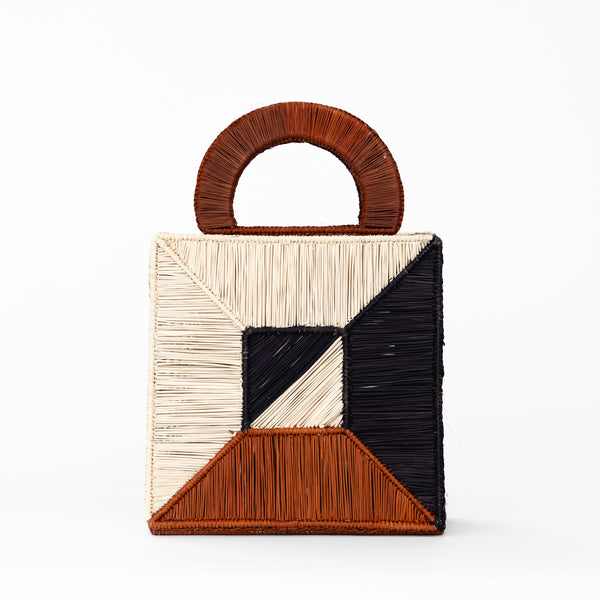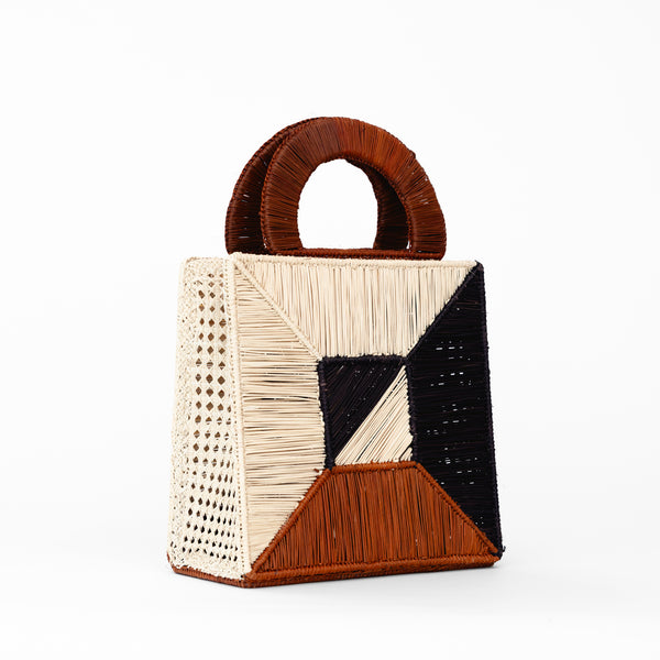 A structured straw handbag designed for effortless summer style, perfect for warm-weather outings, vacations, or evening events. Featuring a geometric woven pattern in natural and warm earthy tones with a circular top handle, its compact size carries your essentials while adding a bold artisanal statement.