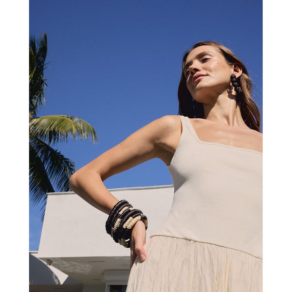These woven bangles in contrasting midnight and natural tones brings a sculptural touch to any look. Lightweight yet striking, it is designed to be worn alone or stacked for a statement of relaxed sophistication.