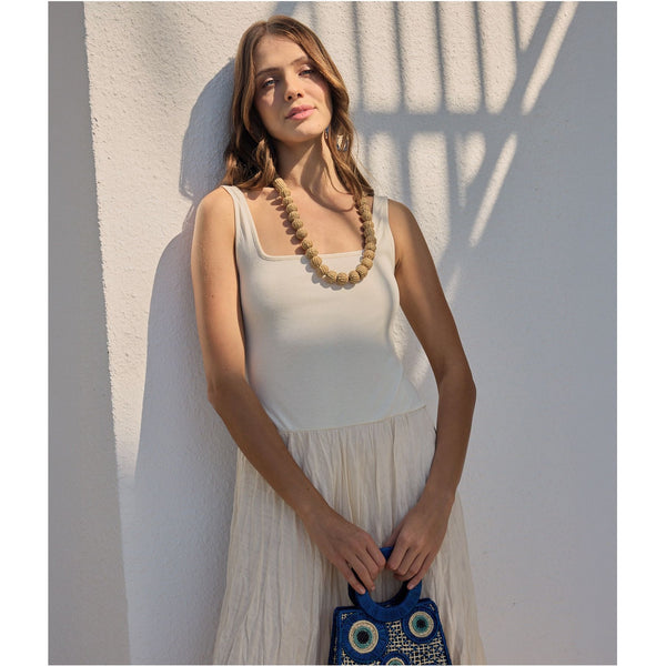 This statement necklace features oversized natural beads that bring warmth and organic beauty to any look. Bold yet timeless, it is designed to complement relaxed summer dressing with understated sophistication.